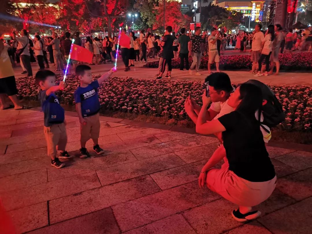 在海珠广场的街道旁,一对儿小男孩手举着国旗放声歌唱,奶声奶气却又笃定严肃,吸引了不少过路人的目光。