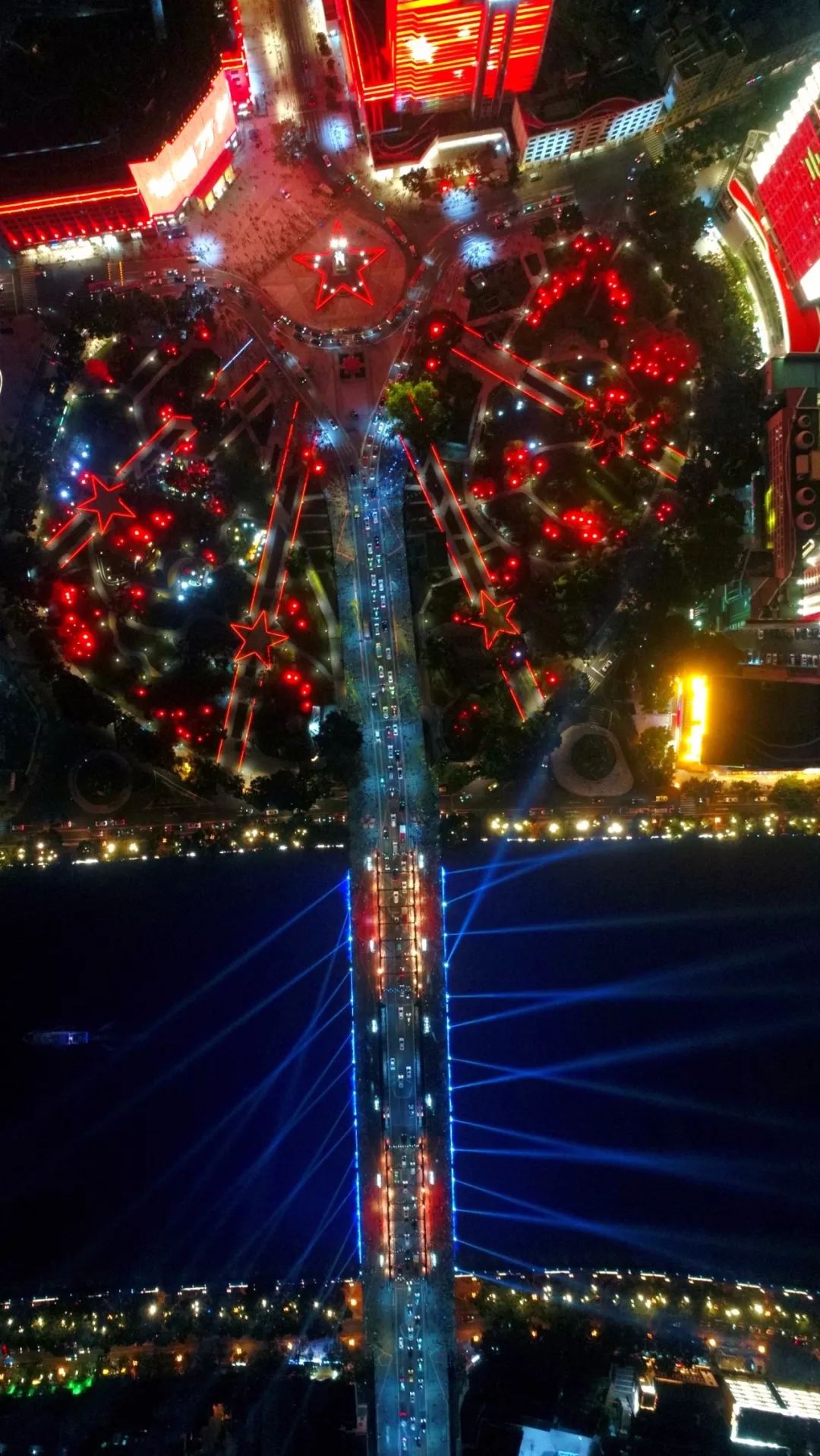 从海珠桥上往海珠广场方向行进,便能看到一幅恢弘的红色画卷在面前壮丽展开。从珠江边望去,沿江建筑与海珠桥、解放桥整体联动,交相辉映,楼宇亮化灯光、地面灯光、空中光束灯光隔空“握手”,频频互动,共同点亮传统中轴线,形成恢宏的江畔巨幅画卷。