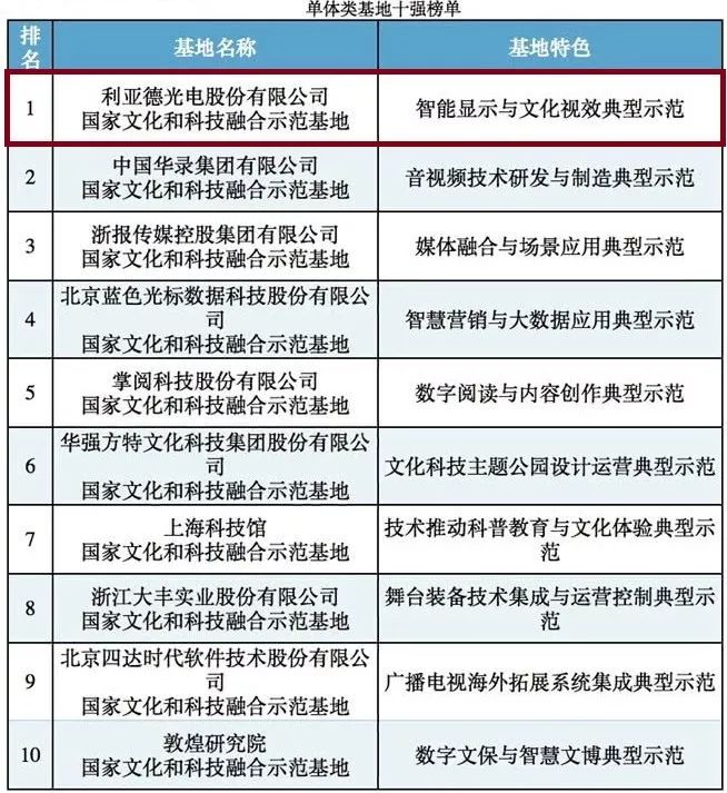 利亚德光电股份有限公司成功入围单体类基地十强并排名榜首